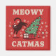 Retro style illustration with "Meowy Catmas" text design and cute black cat, Christmas tree, snowflakes, gifts, paws and stars decoration