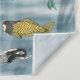 This illustration features an array of merfolk from around the world. The merbeings depicted include: a blonde-haired northern European mermaid, a red-capped male merrow of Irish lore, a blue-skinned Danish havmand, a necklace-wearing bonito maiden from the traditions of the Sa'a people of the Solomon Islands, a human-faced Japanese ningyo, and a red-eyed kaaiman of South Africa.