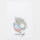 A magical mermaid and fish illustrated personalized nursery blanket. Blue pink and green pastel hues on a neutral white background. A cute way for kid's to carry their keys.