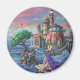 If you love mermaids, then this painting is for you. Mermaid Castle painted by Traci Van Wagoner features a mermaid with purple hair in front and a mermaid with green hair sunning herself on rock islands while another mermaid with pink hair swims in the ocean in front of a castle with a purple, orange and yellow sunset sky behind. This beautiful and whimsical fantasy art makes a great gift and a stunning decoration for your office or home.