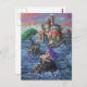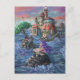If you love mermaids, then this painting is for you. Mermaid Castle painted by Traci Van Wagoner features a mermaid with purple hair in front and a mermaid with green hair sunning herself on rock islands while another mermaid with pink hair swims in the ocean in front of a castle with a purple, orange and yellow sunset sky behind. This beautiful and whimsical fantasy art makes a great gift and a stunning decoration for your office or home.