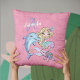 Custom mermaid pink and gold scales throw pillow for a girl's bedroom. Monogrammed with her initial and name. It features a cute blond mermaid, a dolphin, and a turtle with stars and other sea creatures.