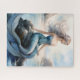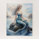 Jigsaw puzzle of a serene mermaid with long flowing hair sitting gracefully on a rock surrounded by calm ocean waters and distant cliffs. Soft pastel colors enhance the tranquil and magical atmosphere of the scene.