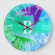 Bold and trendy mermaid tails and scales clock in hues of purple, teal, blue, and green with custom white monogram letter!