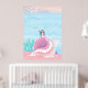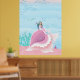 Mermaid admiring herself with a water lily crown in a mirror, sitting on a big shell with a little seahorse.