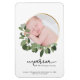 Minimalist Christmas card design with a modern, script font for "Merrier" to celebrate and share your excitement on the recent birth of your baby this year. Baby's first Christmas greeting is so special. Featuring the beautiful gold ring that delicately decorated with green leaves and white flowers to create a half wreath for a holiday feel that reflects your style. Personalize with your family's last name, baby's birth stat information (weight, birth date, length) and with baby's photo alone or choose a family photo on this flexible magnet card.