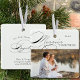 Merrier Together Christmas photo ornament which you can personalize with your favorite photo and personalized wording. Elegant typographic design with swirly calligraphy and easy to edit for a family or romantic couple. This holiday ornament is lettered with Merrier Together on one side and editable text on the other. The sample text reads "our first christmas Together .. loving life together since [date]". All the text, except Merrier and Together is editable.