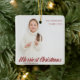 Wishing you the Merriest Christmas. Elegant red calligraphy over your full family photograph ornament. A simple, modern holiday keepsake gift monogrammed with your name and year. Double sided with 2 photos, one photo on each side.