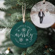 Personalize this stylish holiday ornament with your names and the year for a chic way to commemorate your first married Christmas! Perfect for newlyweds, round ornament features "merrily ever after" in a mix of white calligraphy script and block typefaces, accented with white snowflakes on a festive spruce green background. Add your favorite wedding photo to the reverse side.