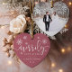 Personalize this festive red holiday ornament with your names and the year for a chic way to commemorate your first married Christmas! Perfect for newlyweds, this heart shaped design features "merrily ever after" in a mix of white calligraphy script and block typefaces, accented with white snowflakes. Add your favorite wedding photo to the reverse side.