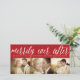 This modern and minimalist holiday/christmas wedding announcement card features the word 'Merrily Ever After' in a simple and trendy white handwriting script calligraphy on red with 3 photo collage.