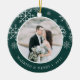 Elegant photo Christmas ornament for newlyweds features a favorite wedding photo on each side, framed by white snowflakes on hunter green. Personalize with a custom caption on each side; shown with "Merrily Ever After" on front and your names on the back.