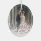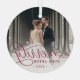 Elegant holiday photo ornament for newlyweds features a favorite wedding photo with "Merrily Ever After" overlaid in chic calligraphy script. Personalize with the year at the bottom.
