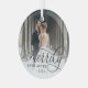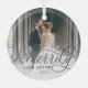 Elegant holiday photo ornament for newlyweds features a favorite wedding photo with "Merrily Ever After" overlaid in chic calligraphy script. Personalize with the year at the bottom.