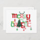 Merry and Bright Christmas in red and green lettering with retro ornaments, Christmas tree, and antlers.