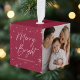 Modern holiday photo cube ornament featuring "Merry and Bright" displayed in a hand-lettered script encircled by a border of white stars against a cranberry background. Personalize the front of the ornament by adding your family name and the year. Add 3 of your favorite photos to create the perfect keepsake to give to friends and family.