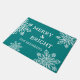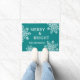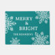 Festive holiday doormat with merry and bright typography ,white snowflakes pattern on a Teal background. Personalize with family name.