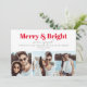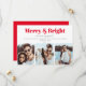 A modern " Merry and Bright" 3 photo collage Christmas/ Holidays engagement announcement card. The design features bold, red and modern typography. On the rear side of the card, the design features festive bright red color and more customizable text.
