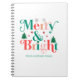 Merry and bright modern font, pine trees, and snowflakes on white background.