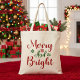 This fun and festive holiday tote bag features the saying "Merry And Bright" in traditional Christmas red and green colors.
