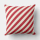 Seasonal pillow design features elegant "Merry and Bright" text design with star accent and a pattern of cardinal red and soft white / light ivory candy cane stripes.