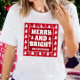 Stylish and cute white t shirt for women features a trendy Christmas holiday 'merry and bright' white typography holiday design with snowflake and star accents on red checkerboard background.