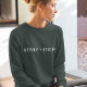 A stylish modern holiday sweatshirt with a bold typography quote "Merry + Bright" in white with a dark forest green feature color. The greeting can be easily customized for a personal touch. A trendy, minimalist and contemporary christmas design to stand out this holiday season! #christmas #merryandbright