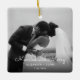 Married Merry First Christmas Black White Photo Square Ceramic Ornament. The design features a customizable black-and-white photo on each side. Married and Merry on the front and First Christmas on the back of this holiday ornament. This modern elegant design can be personalized by clicking on the 'Personalize' button. To change the wedding photo to a colored picture, click on 'Personalize' and change the filter to none. 'Assistance with design or matching products are available at truullc@gmail.com.