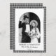 Elegant Merry and Married Arch Wedding Photo Holiday Card. Celebrate your first holiday season as newlyweds with this elegant arch photo card. The front features a modern “Merry and Married” typography, complete with your family name in a hand-lettered script and year. On front framed in a chic black and fwhite plaid pattern. The back a greeting text template showcases on a coordinating black and white plaid pattern for a timeless, festive touch. A perfect way to share your joy and newlywed holiday cheer with loved ones.
