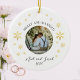 Commemorate your special day with our Merry and Married Christmas ornament featuring your wedding photo. Set against a white background with delicate gold snowflakes, this ornament is adorned with an informal, casual handwritten script, perfect for adding a personalized touch. Customize with the couple's name and wedding date. This thoughtful keepsake is a beautiful gift for newlyweds to celebrate their first Christmas together. Ideal for cherishing memories and adding a personal, elegant touch to your holiday decor!