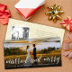This modern and minimalist holiday/christmas wedding announcement 8" x 4" card features the word 'Merry and Married' in a simple white script calligraphy overlaying a full bleed photo.