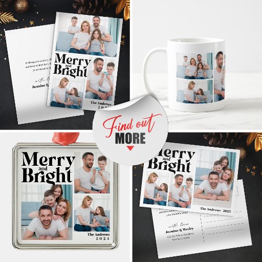 Capture the magic of your family Christmas with this modern and stylish photo collage Ornament. Featuring a bold, graphic design with a cheerful "Merry and Bright" sentiment, this Ornament is perfect for showcasing your family's love and joy this holiday season. Personalize it with your favorite photos, names, and message for a truly unique and memorable Christmas greeting.