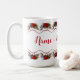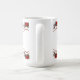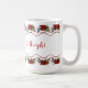 White and red colors are bold and fresh for the holidays. This mug has a border of bright red poinsettia garlands on top and bottom. A fun message, “Your name” be merry and bright!” Enjoy your cafe’, and share one for a friend.