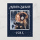 Merry & Bright typography. Navy blue background with white starlights design with your favorite photo in the center. Personalize with your message and name on the reverse side. The perfect holiday greeting card.
