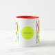 This holiday coffee mug features a modern typography design that reads "Merry & Bright" in red, green orange, turquoise and lime green. In the center is a green dot with a name for you to personalize. Designed by world renowned artist Tim Coffey.