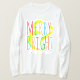 This holiday shirt features a modern typography design that reads "Merry & Bright" in red, green orange, turquoise and lime green with your name below to personalize. Designed by world renowned artist Tim Coffey.
