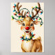 A vintage illustration of a cheerful reindeer with a glowing red nose and Christmas lights wrapped around its antlers.