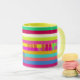 Celebrate the holidays in bright modern style with this merry rainbow stripe holiday mug, A colorful gift that is certain to delight family, friends, and co-workers who appreciate color with their coffee or tea. Bright striped background with a star topped geometric stripe Christmas tree. merry text completes the festive vibes.