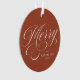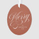 Elegant Christmas ornament featuring "Merry" on the front in a white calligraphy script overlay with a terracotta brown background. Personalize the front of the ornament by adding your name and the year in white lettering. The back of the ornament displays your photo.