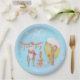Whimsical Chris-Moose is dressed in his holiday fineness with a red and white striped scarf and a Santa Hat. His antlers are decorated with Christmas stockings, clocks and ornaments. Beside him is a stack of wrapped Christmas gifts. A red bird wearing a Santa hat is sitting in a tree next to his bird house. A Christmas stocking is hanging from the tree with a gift already in it. Typography says "Oh so jolly". Background is blue with sparkling and twinkling stars all over. These would be adorable paper plates for your Christmas get togethers with friends and family!