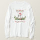 This beautifully illustrated shirt has a whimsical moose who's antlers are decorated with Christmas stockings and Christmas ornaments. He's standing amongst winter greenery, pinecones, red berries and ribbons. Shimmery gold foil snowflakes are scattered about. Below him it says