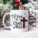 Mug features the words 'Merry Christ Mas' in black decorative script with a red and black checked Christian Cross as the "t" in Christmas, with snowflake decorative accents.