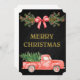 "MERRY CHRISTMAS" Greeting Card has the iconic red pick-up truck hauling away the family Christmas tree, ready for decorating. The top has a bough of branches and berries adorned with a red bow. The center has a traditional font, in a mustard-gold color, and the words "MERRY CHRISTMAS".