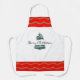 This holiday apron starts with a white background. On the top and bottom, there's a thick red boarder, with a gold color glitter wave. In the center there is an evergreen tree and the words “Merry Christmas”. Text can be customized .