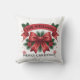 Custom double-sided throw pillow with your family name, the message "Merry Christmas", and a big red bow in the center with mistletoe, stars, and snowflakes on a white background.