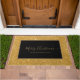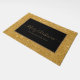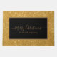Elegant Merry Christmas Doormat with a golden script on a black background embellished by a gold glitter backdrop. Personalize with your family name or text.