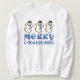 Christmas sweatshirt features a row of snowman-shaped sugar cookies. MERRY CHRISTMAS is printed in a fun blue font. Perfect for holiday celebrations or for an ugly Christmas sweater party!