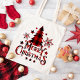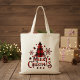 This festive modern farmhouse tote bag features a red and black buffalo plaid evergreen tree, snowflakes and "Merry Christmas" greeting.