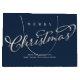This design features a Merry Christmas cute calligraphy script, an elegant silver snowflake pattern, a navy blue motif pattern style, winter snow elegance whimsical, a stylish trendy calligraphy script font, minimalist minimal white lettering, Christmas holiday wrapping supplies, custom customized gift message greeting, Christmas holiday paper gift packaging, simplistic party favor gift packaging