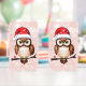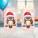 This charming design features a detailed illustration of a brown and white owl perched on a branch. The owl wears a red Christmas hat sprinkled with white snowflakes, adding to the festive spirit. Its large captivating eyes draw attention, while a small red gift with a white ribbon subtly rests at the base of the branch, suggesting the generous nature of the holiday season. This design captures the warmth and joy of Christmas through the representation of this iconic winter bird in a cozy and celebratory setting.
